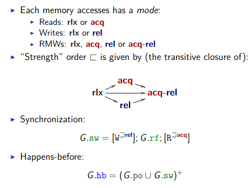 简化模型 在RA的基础上,为变量的访问添加访问模式(access mode): C/C++11中,只计算同步的读写对coherence的贡献: 实际模型 四种访问模式: non-atomic : 默认 relaxed release/acquire sc