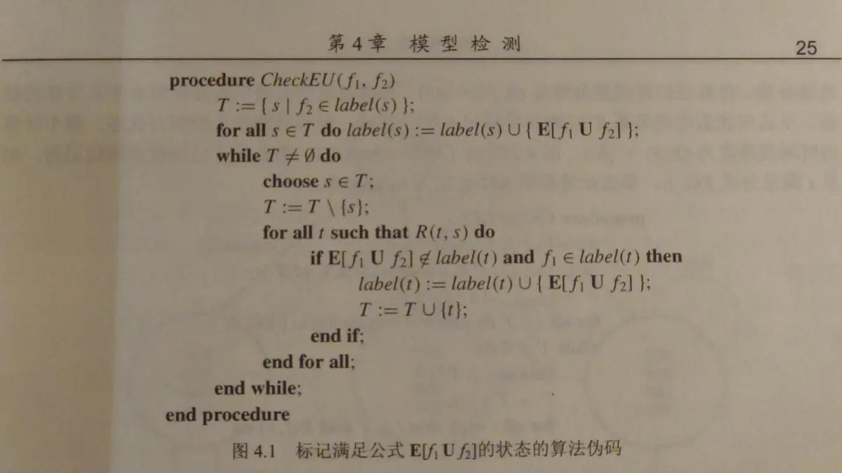 对于 E[f1 U f2],基本思路是先找出所有f2满足的状态,然后沿变迁关系向前搜索满足f1的状态组成路径,并将路径上的所有状态标记上 E[f1 U f2]