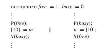 不过,线程间往往需要通过共享的资源进行通信。CSL支持所有权的动态转移(所有权并不属于程序语义,而是只用于证明的概念)。与之相对地则是基于语法静态确定临界区。下面的程序中信号量的使用确立了对地址10的互斥访问,但在语法上并没有清晰的临界区: