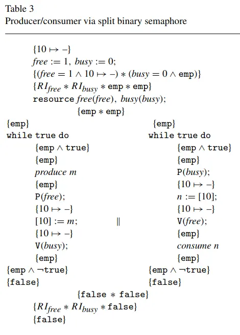 如上所述,CSL中表示线程当前对e的独占,而除了被某个线程占有外,e也可能被某项资源(比如信号量,条件临界区等)占有。这在本文中体现为资源不变式RI。资源不变式可以近似描述资源占有所有权的条件。当满足条件时,线程可以通过资源不变式获取所有权e,或者将所有权e放弃以保持资源不变式成立。