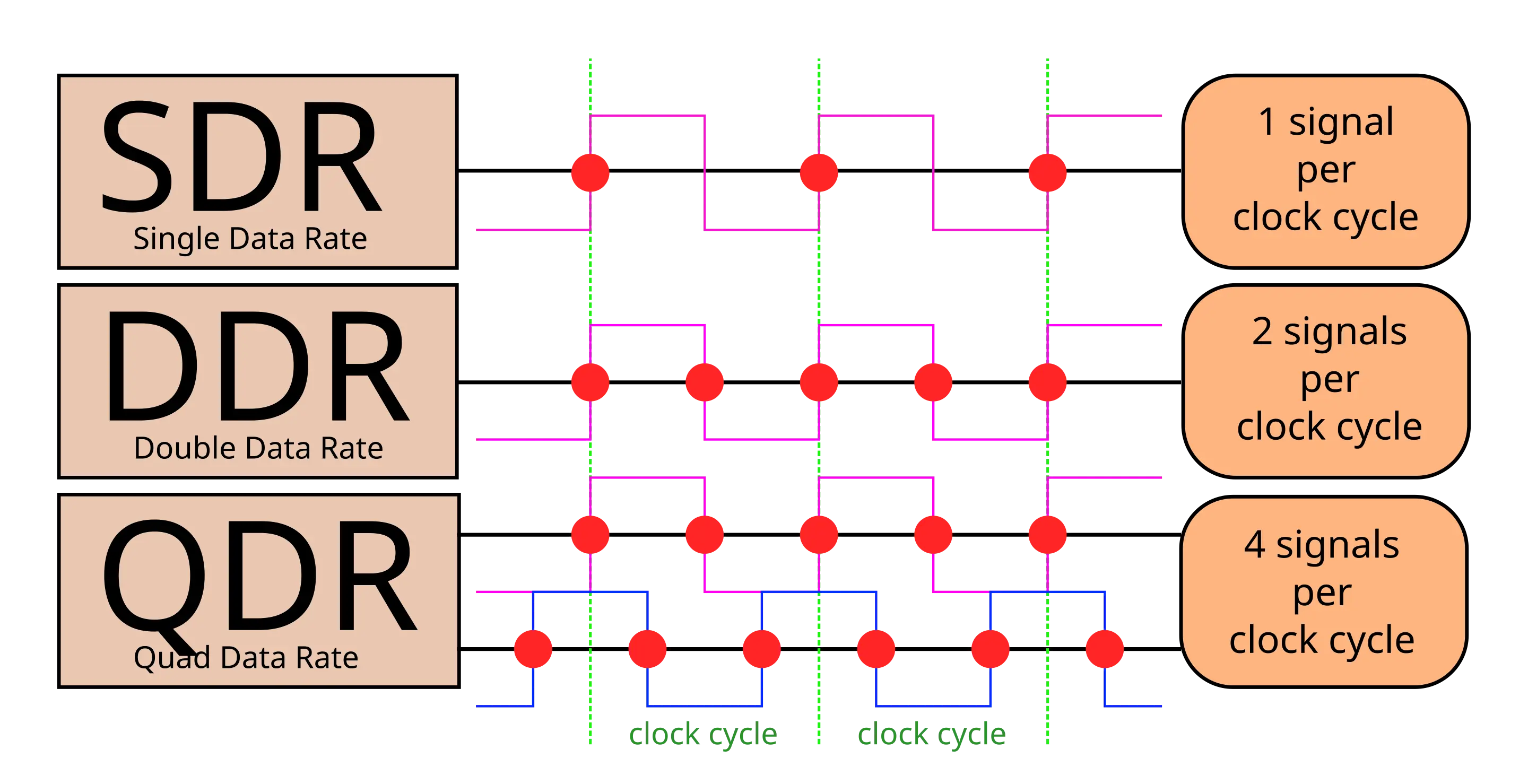 即 Double Data Rate,指在时钟信号发生突变的时点进行传输,无论其为上升或下降。如下图所示(来自维基) 一般传输的单位是 T/s,为时钟频率(赫兹)的两倍。不过日常中也有直接用赫兹来度量传输频率的。乘以总线宽度就是带宽。