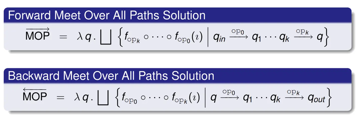 这种解称为MFP solution (Minimal/Maximal Fixed-point),可能不精确。MOP Solution(Meet Over All Paths) 通过计算每条路径的信息,最后合并,因此更加精确,但这通常是不可计算的: