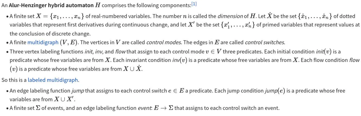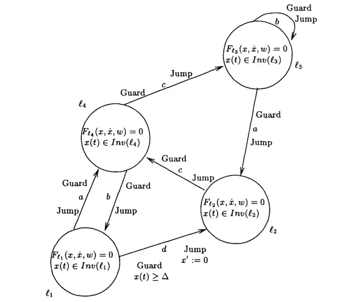 离散变迁发生时,连续状态有一跳变(jump)。离散状态对连续行为有影响(不变式、微分方程),同时连续状态也对离散行为有影响(guard)。
