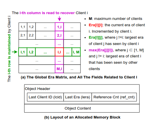 “the recovery service should first check the header of the last object (lo) that is modified by the failed client. The address of lo is recorded in client i’s redo log entry. If lo.lcid i and lo.lera Era[i][i], a redo is needed (Condition 1). Otherwise, the recovery service also needs to compare the failed client’s era, with the maximum era of client i that has been seen by any other clients. If Era[i][i] ⇐ max(Era[j][i], j!=i), a redo is also needed (Condition 2).” (Zhang 等, 2023, p. 665)