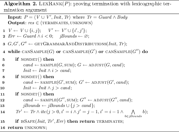 使用SyGus(见程序综合的一般原则)的方法,为(非)终止性分析问题寻找ranking function和recurrence set。方法是从程序的语法片段中,构建出一个CFG文法G,从中可以采样语句、表达式等。